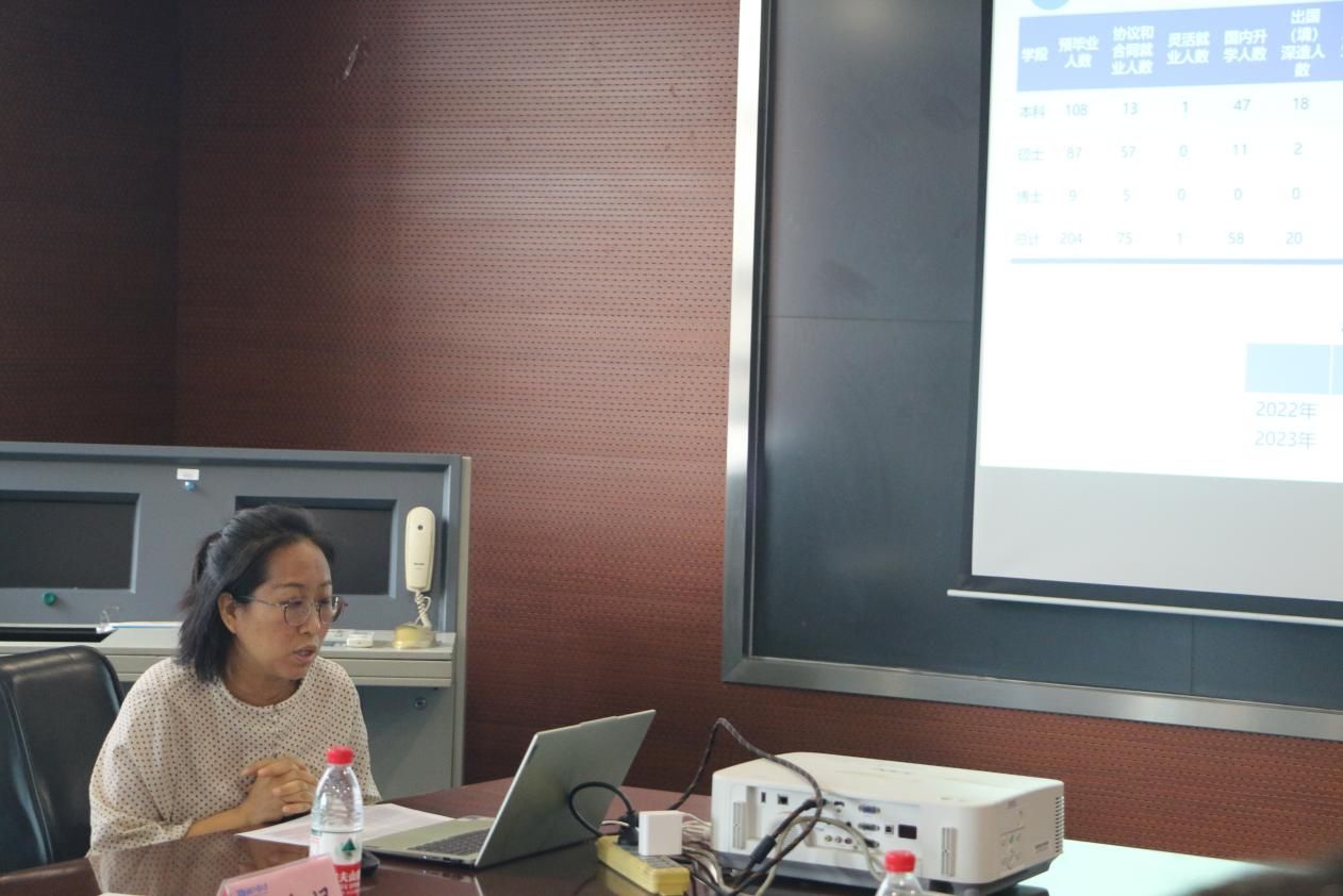 会上党委副书记高阿娜介绍了公司23级本科毕业生就业情况及进展,落实本科生毕业的路径,当前工作的重点、难点,并提出下一步工作计划。