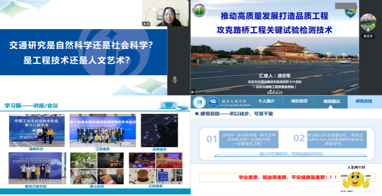 李春艳所长聚焦现代交通发展痛点,引领学子深度思辨交通学科的本质内核。交通研究兼具自然科学与社会科学双重属性,是融合工程技术严谨性与人文艺术创造性的交叉领域。为学子提供了学科认知的新维度。薛忠军站长紧扣“高质量发展”时代命题,系统阐释公路品质工程的核心标准。结合典型案例,着重强调科研学习必须深度对接国家战略需求,将技术创新作为服务现代化建设的核心引擎。研究生时玥、马亭分享了在北工大的学习生活与成长经历,为学子提供了鲜活的奋斗范本。