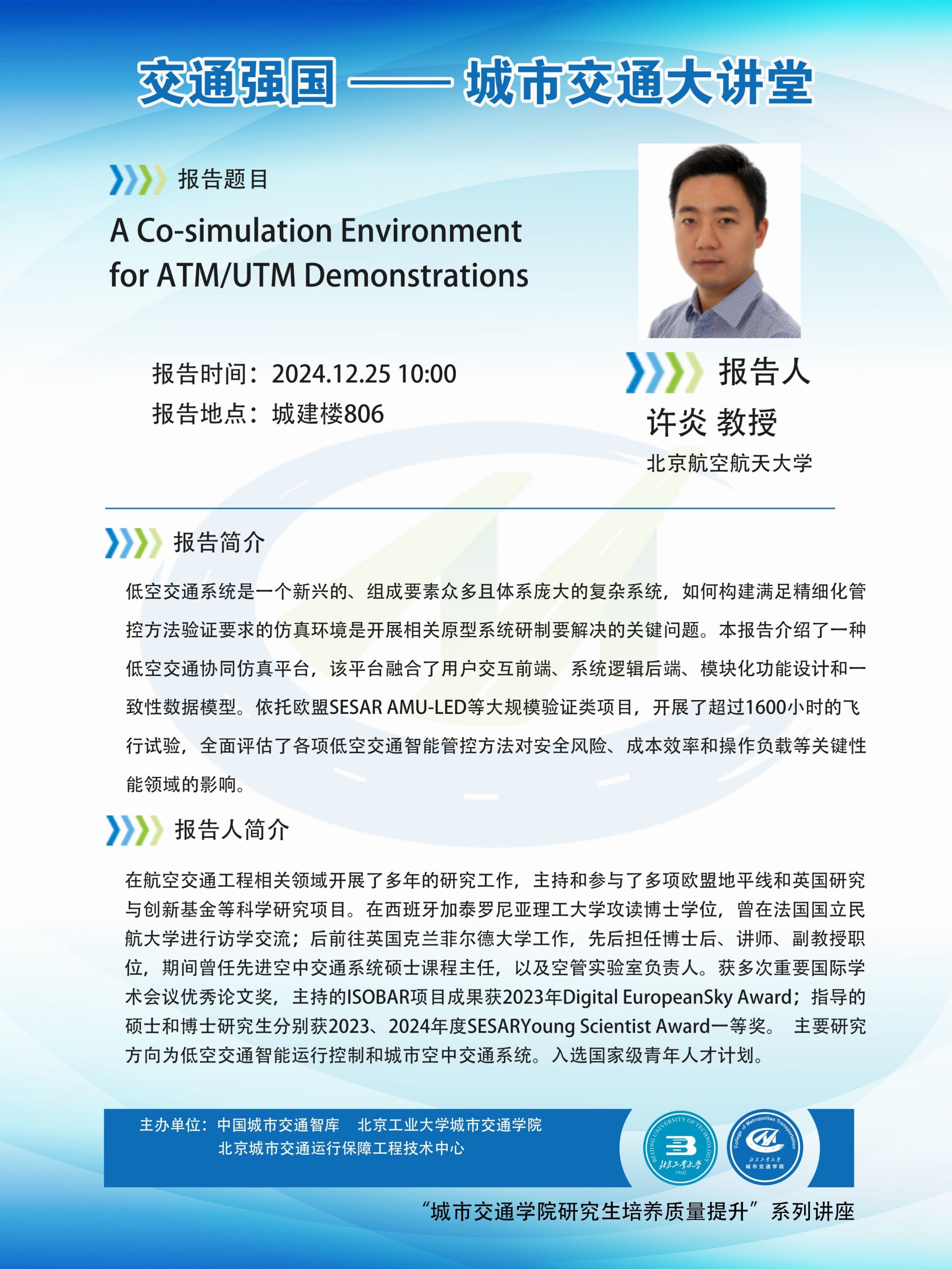 【交通 | 学术报告】 交通强国·城市交通大讲堂——A Co-simulation Environment for ATM/UTM Demonstrations