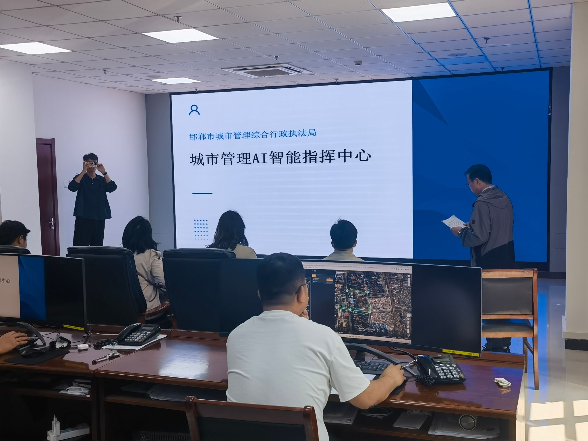 5月10日上午,师生抵达邯郸后首站前往市城管局城市管理AI智能指挥中心,学习“数据驱动城市治理”的先进经验,探讨如何利用更多智慧化应用提升城市管理效能。