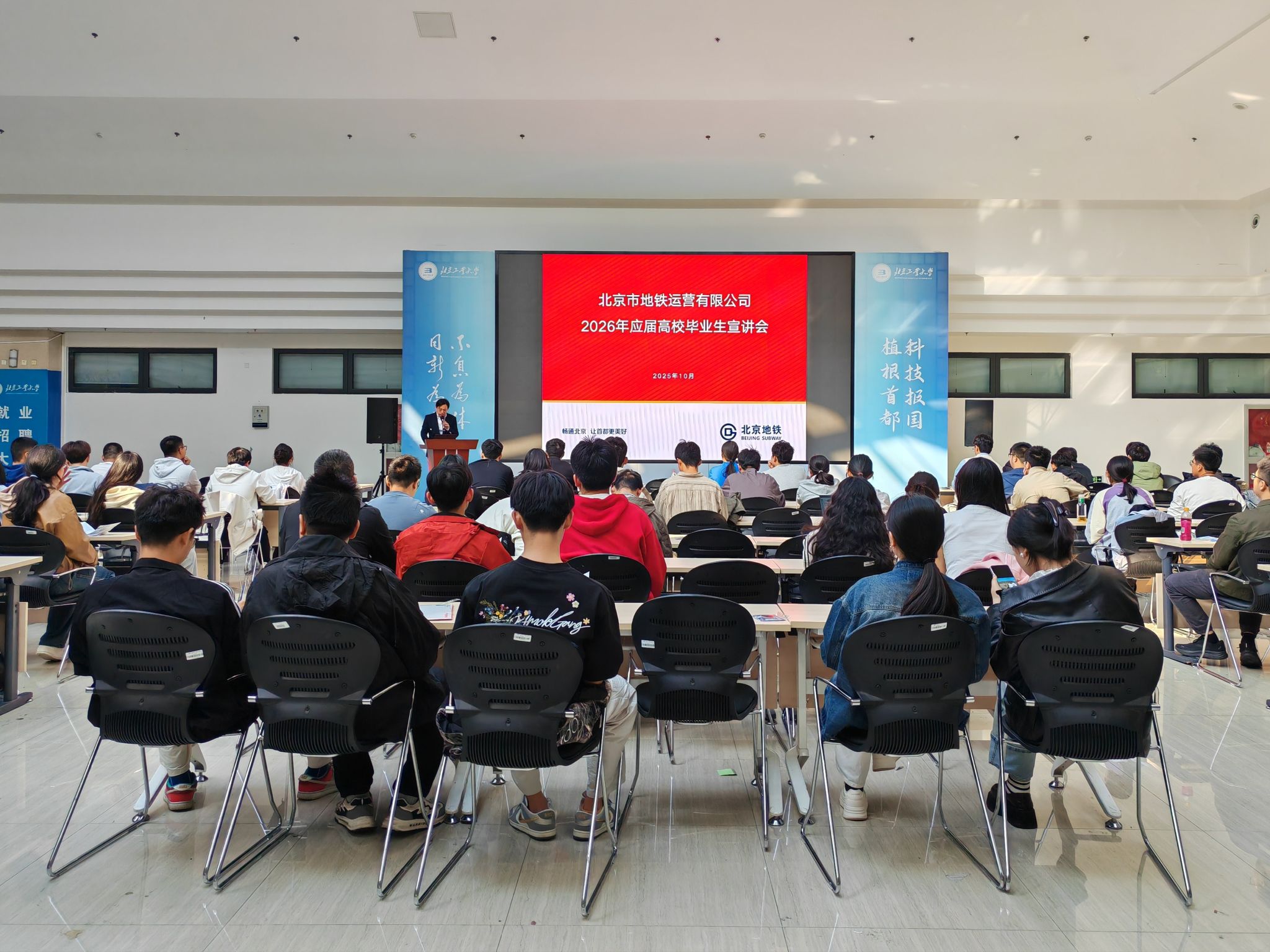 宣讲会上,企业代表围绕北京地铁的发展规划与人才需求,系统介绍了城市轨道交通行业的广阔前景,并就同学们普遍关注的职业发展、岗位要求、薪酬待遇与职业发展通道等问题进行了深入交流。企业代表指出,当前北京地铁正处于高质量发展的关键阶段,随着新线建设持续推进与智慧地铁技术不断升级,对工程技术、运营管理、信息技术等多学科专业人才的需求日益迫切,诚挚欢迎有志于投身首都轨道交通事业的北工大学子加入。