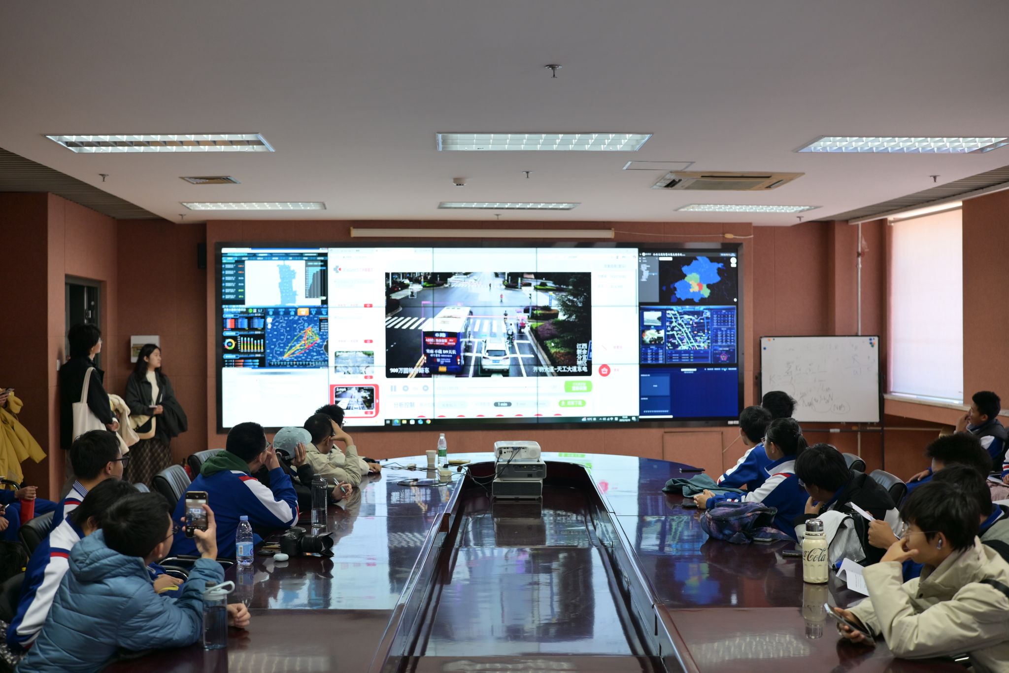 随后,同学们参观了富有交通公司特色的实验室。在综合交通动态室,展示了围绕解决交通拥堵而搭建的大数据平台。平台从手机移动终端和汽车火车站等渠道收集,综合各类交通要素实现对交通拥堵的管控与疏解;此外,实验室展示的结合电子警察、无人机等多视角产生的交管垂直大模型,作为辅助交通警察、监测驾驶员信息以保障交通安全的重要手段。